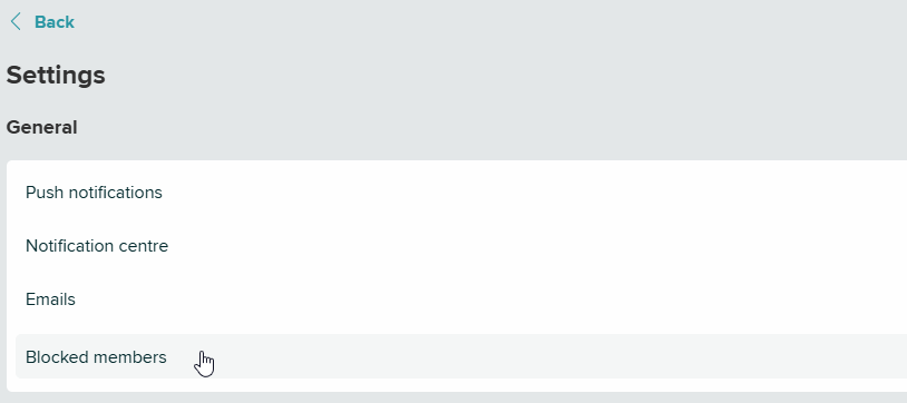Selecting the blocked members option, will take a user to the list of members they have blocked. Tapping on a member and selecting unblock will unblock the member.